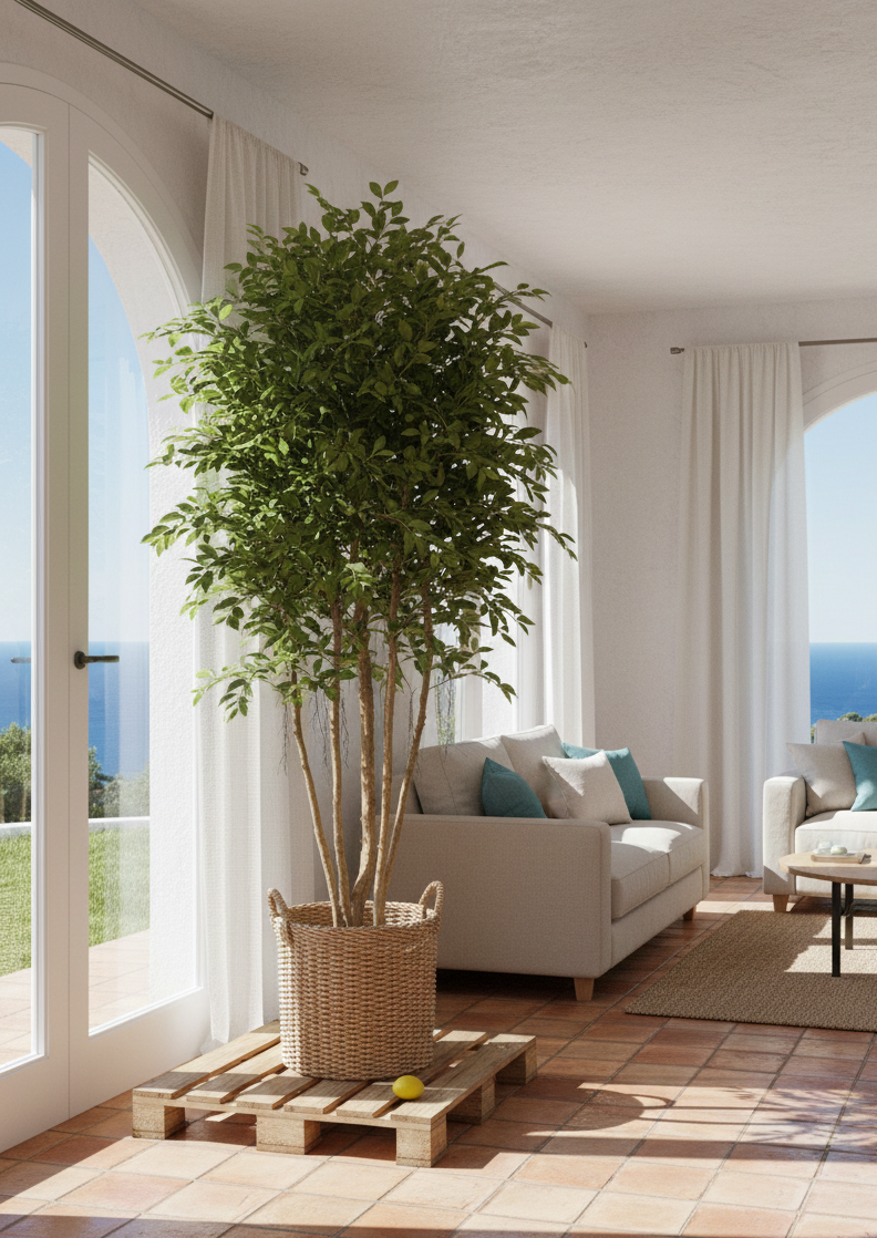 Decorar espacios amplios con árboles artificiales de gran formato es una tendencia al alza gracias a su extraordinario poder decorativo y su asombrosa semejanza con los ejemplares naturales. Nuestro Ficus Retusa de 2.20 metros es un verdadero y espectacular árbol artificial que captura la esencia del mediterráneo, ofreciendo una solución estética impecable donde la calidad se aprecia en cada hoja.