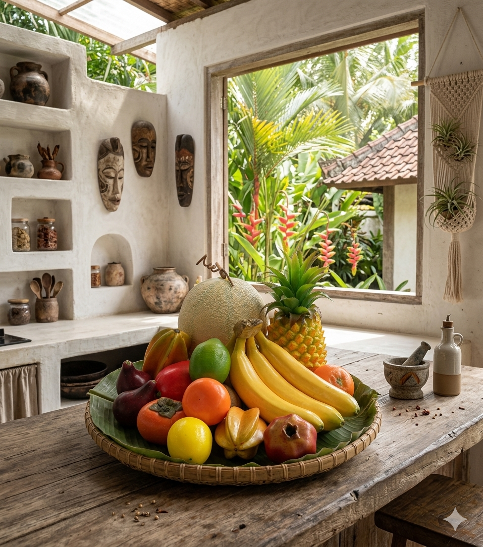 Imagen ideal: La fotografía que generamos de la cesta sobre la hoja de bananera en la cocina exótica es el complemento visual perfecto para este texto, ya que transmite exactamente esa sensación de lujo y realismo que el cliente busca.
