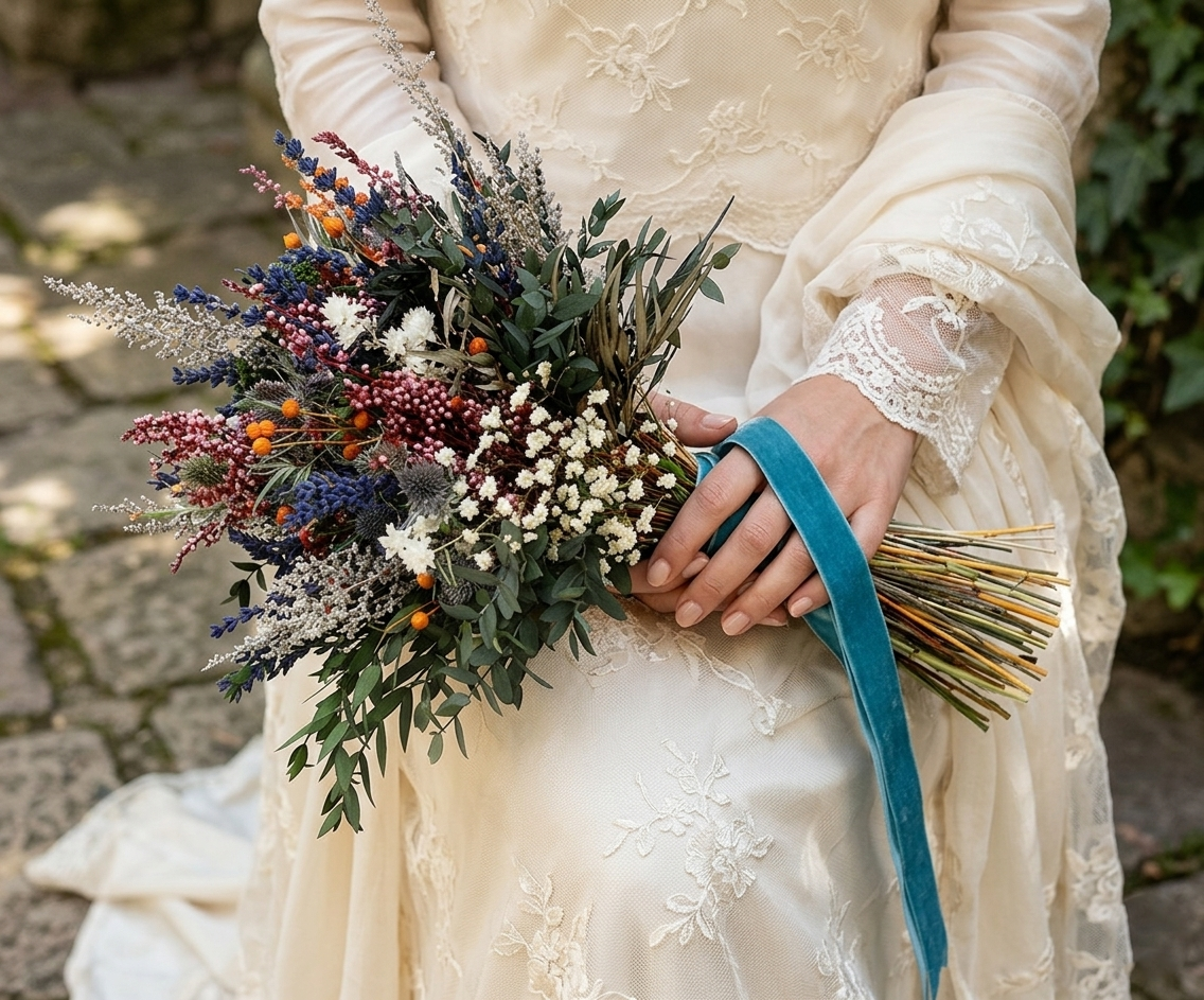 El ramo ideal para la novia bohemia que busca un aire desenfadado pero sofisticado. Compuesto por flores silvestres, flores preservadas en tonos verdes y toques de lavanda, este diseño destaca por su carácter campestre y textura orgánica. Al ser flores eternas, este ramo silvestre será el recuerdo perfecto de tu boda durante años. Disponibilidad de envío nacional.