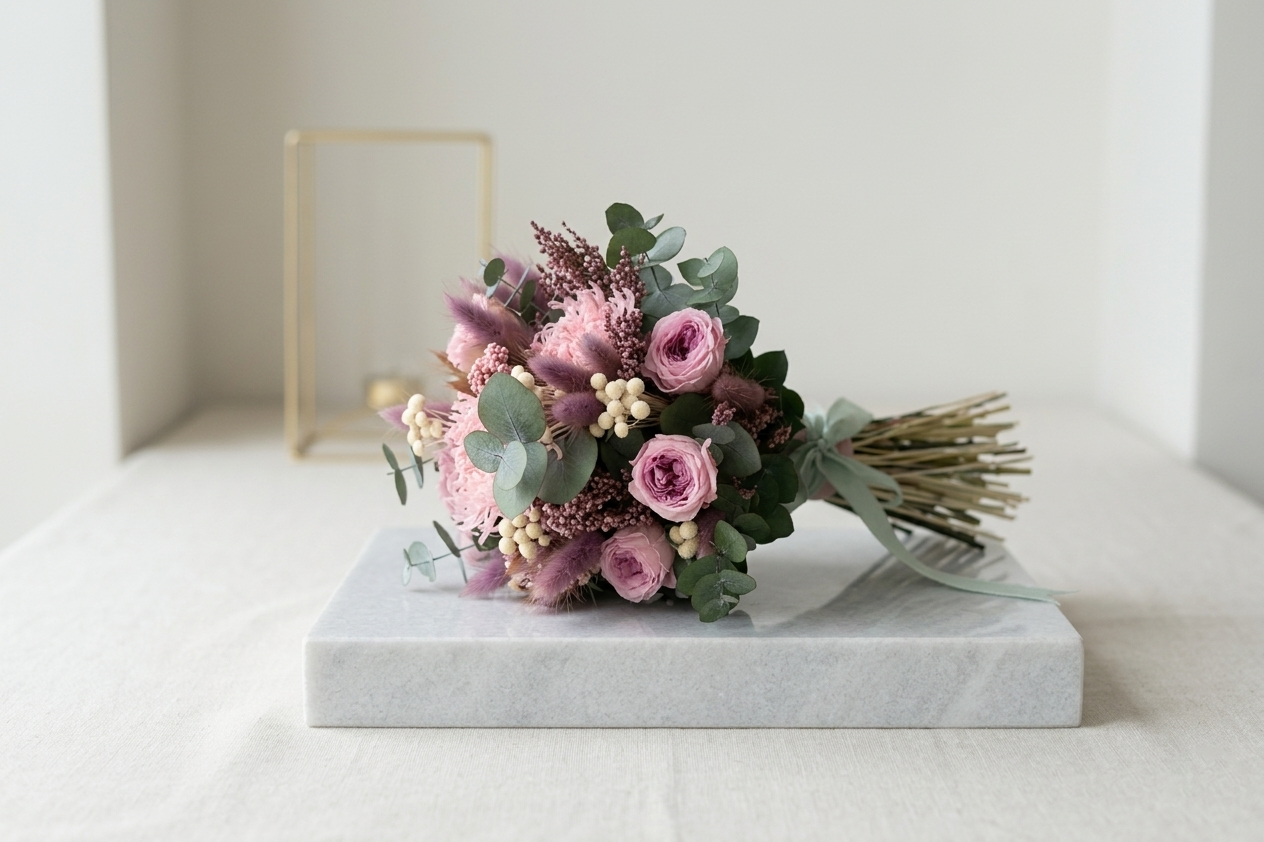 Una joya floral de diseño exclusivo que combina Rosas Austin preservadas, Crisantemo Anastasia, Flor de Arroz, Eucalipto Cinerea, Cola de Conejo, Broom Bloom y Phalaris , en tonos rosa pastel y crema. Este ramo evoca la nostalgia y el romanticismo de épocas pasadas. Es ligero, duradero y está listo para viajar a tu domicilio en cualquier provincia española, manteniendo su belleza intacta.